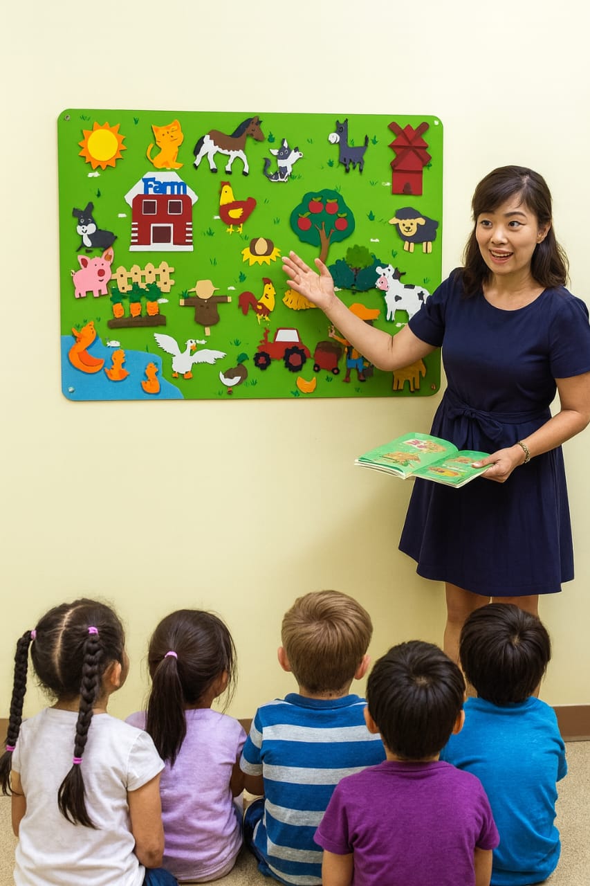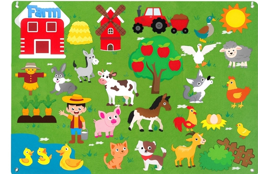 لوحة تعليمية تفاعلية من اللباد مستوحاة من منهج مونتيسوري، مزوّدة بقطع للتلصيق لتنمية الخيال واللغة والتركيز لدى الأطفال في مرحلة التعليم المبكر.
